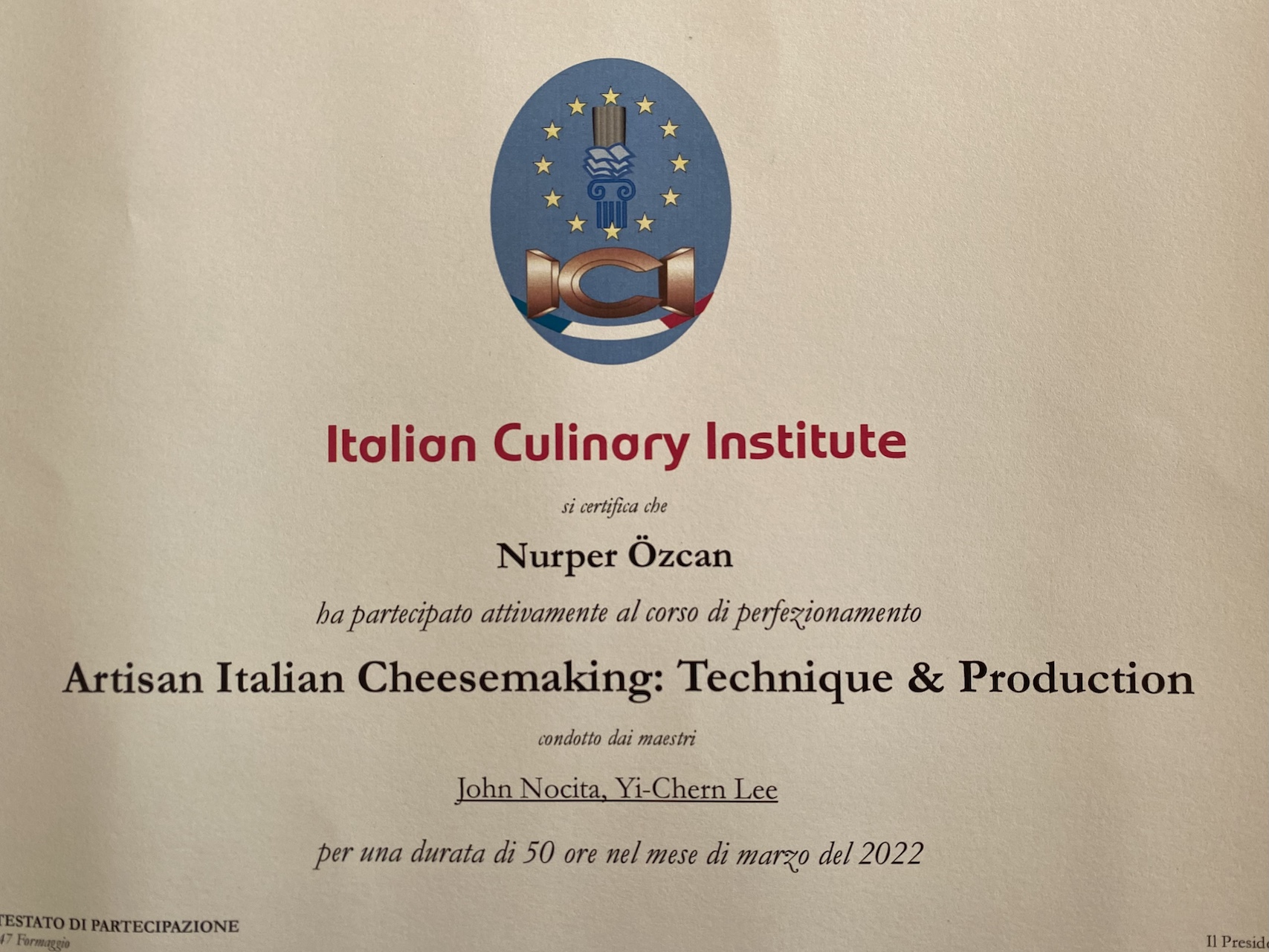 Italian Culinary Institute‘de ‘Artizan İtalyan Peynir Eğitimi’ni başarıyla tamamladım. Master Chef John Notica alanında oldukça başarılı, artizan peynir üretimini, tekniklerini çok iyi bilen bir chef. Süt ve süt ürünleri üretimine ise bakış açımız oldukça benzer.Kendisinden çok kıymetli bilgiler edindim.